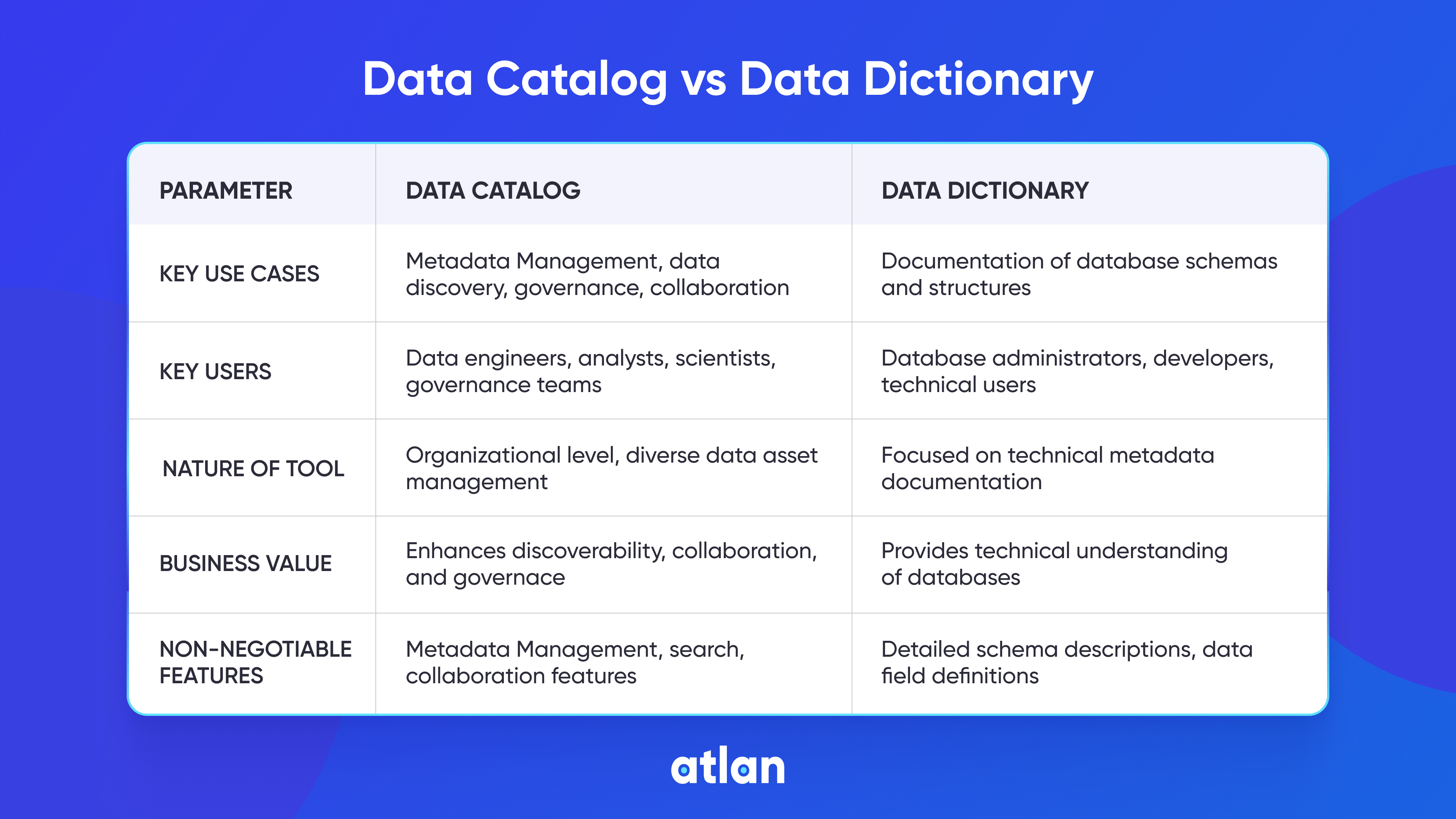 As more and more data teams are feeling the need for and adopting data catalogs, the difference between a catalog and a dictionary is fast vanishing—and becoming more complementary—because catalog tools now crawl and inventory data dictionaries for metadata. Data dictionaries are now an integral part of a data catalog.